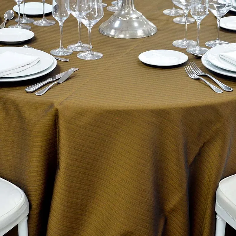 Eleva tus eventos con el Mantel Bronce Redondo. Su tono bronce agrega un toque de lujo a cualquier mesa. Alquiler de manteles en Madrid y Sevilla.
